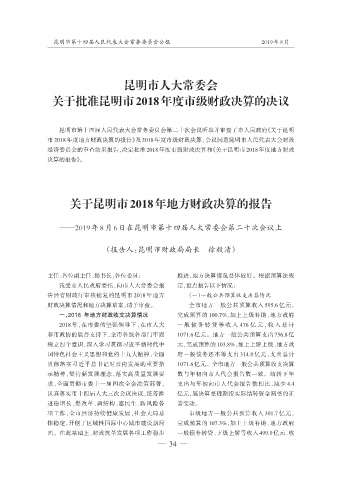 经济委员会的审查结果报告,决定批准 2018 年度市级财政决算和《关于昆明市 2018 年度地方财政